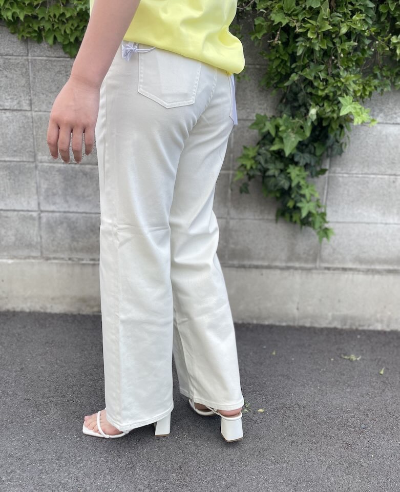 ワイドシルエットでほんのりフレアになっている5ポケットデニム。