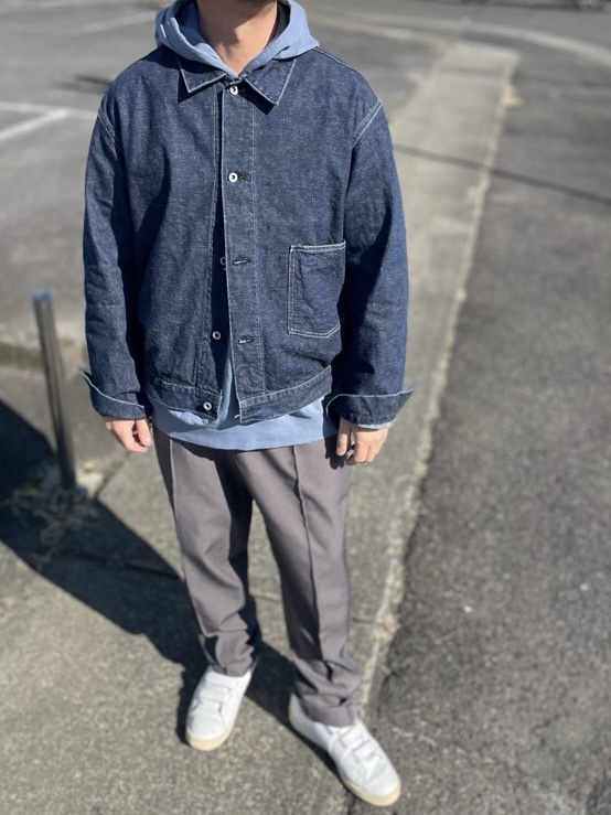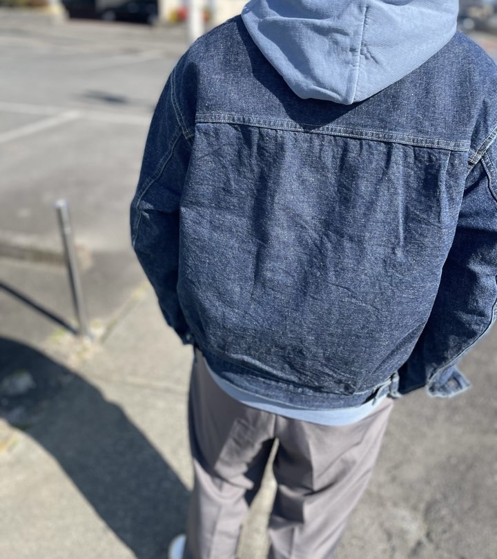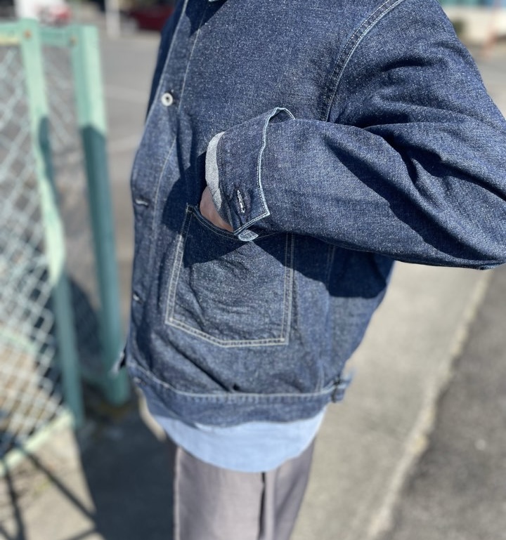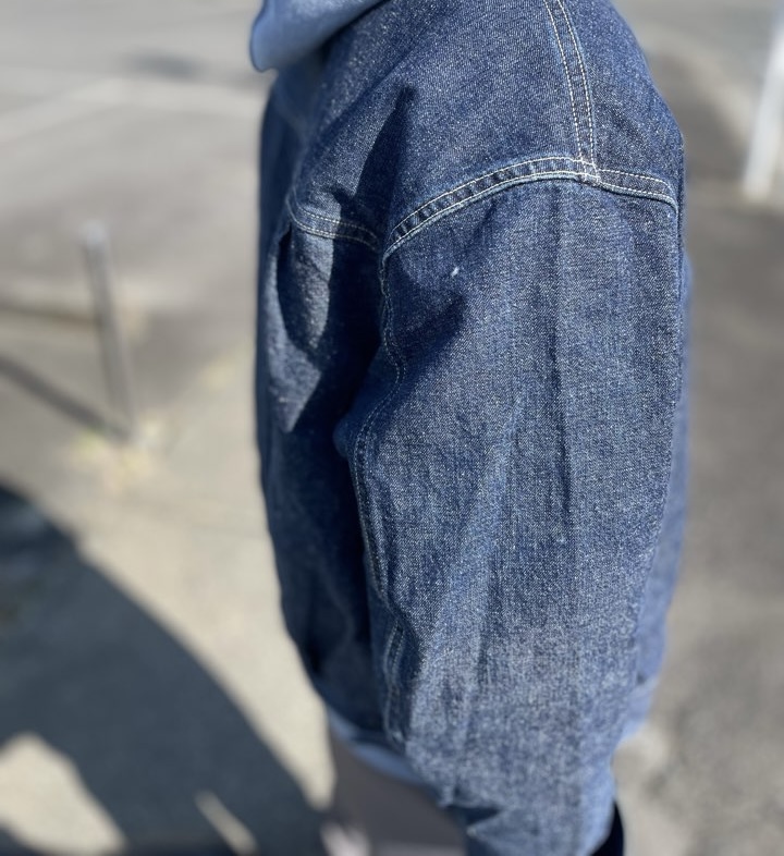 プリーツがないだけでいつものGジャンとは違った表情のデニムジャケットに。