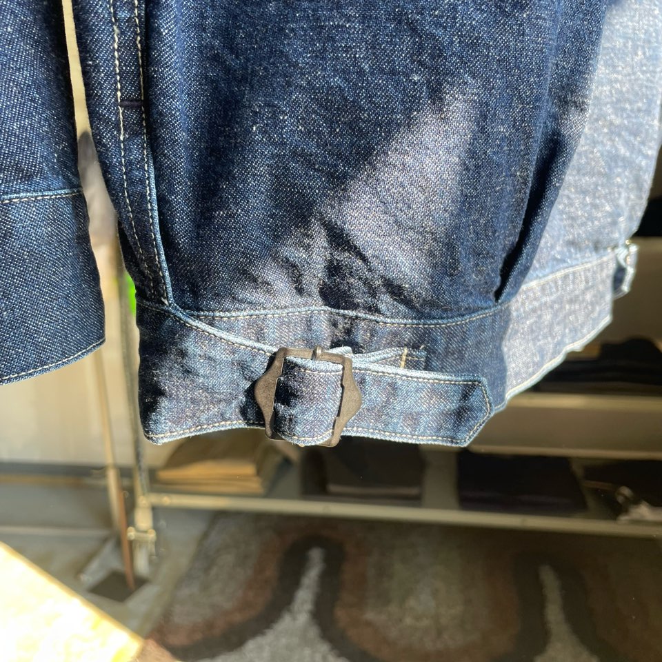 通常はシンチバックやアジャスターが付きますが、ジャケットの雰囲気に合わせてユーロワークに見られるスライドバックルを両サイドに付けてます。