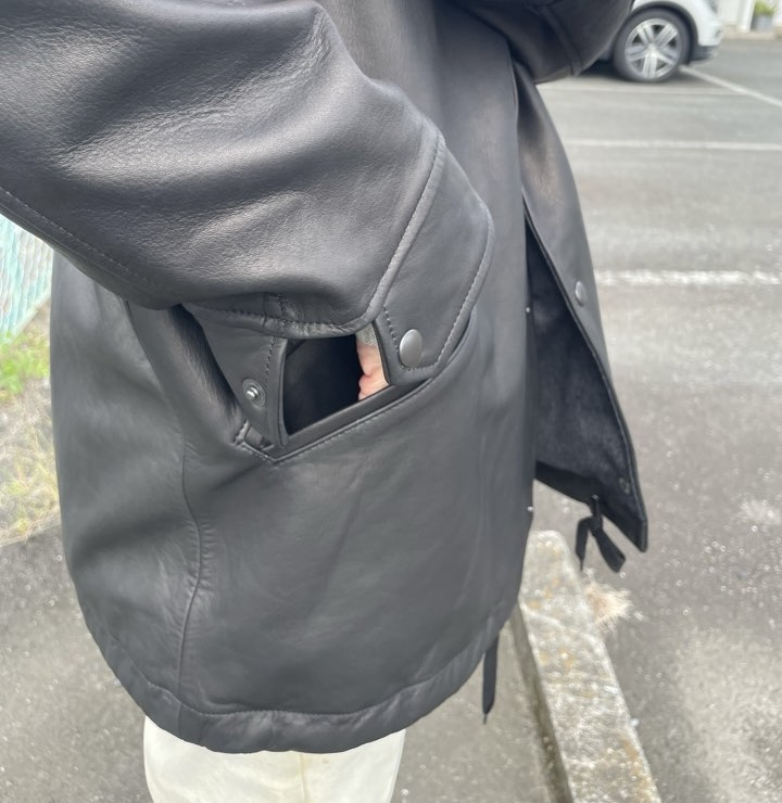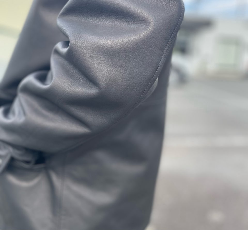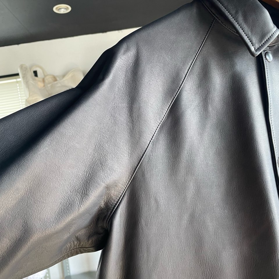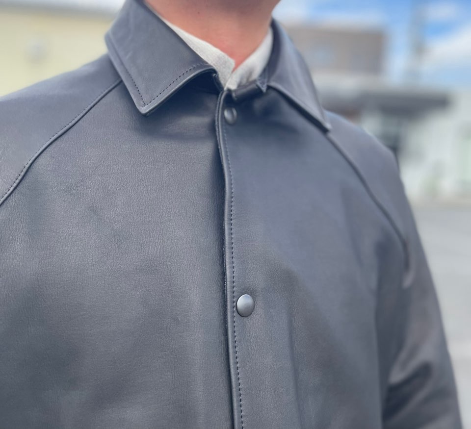 やや硬さのあるレザーですが、極力薄手に仕上げ、袖付けもラグランスリーブにすることでなだらかな肩のライン。