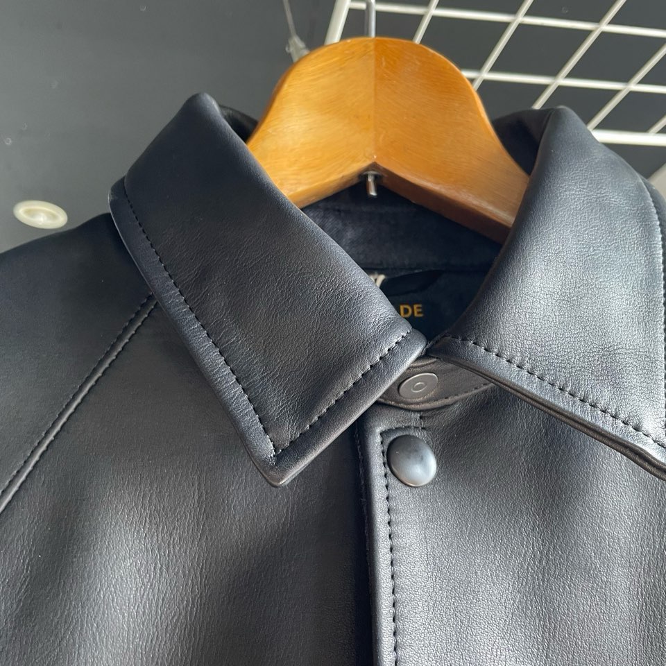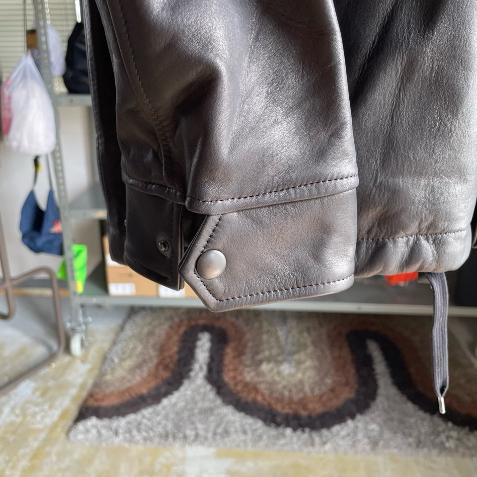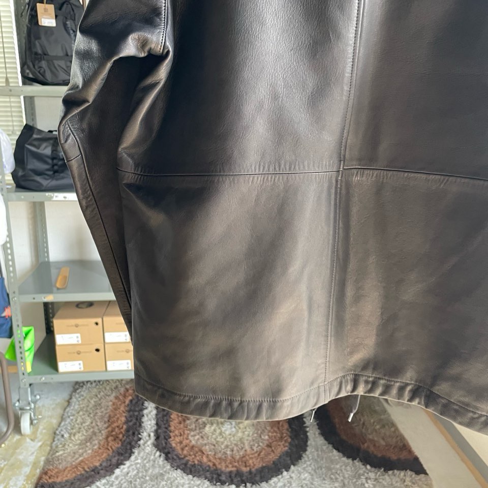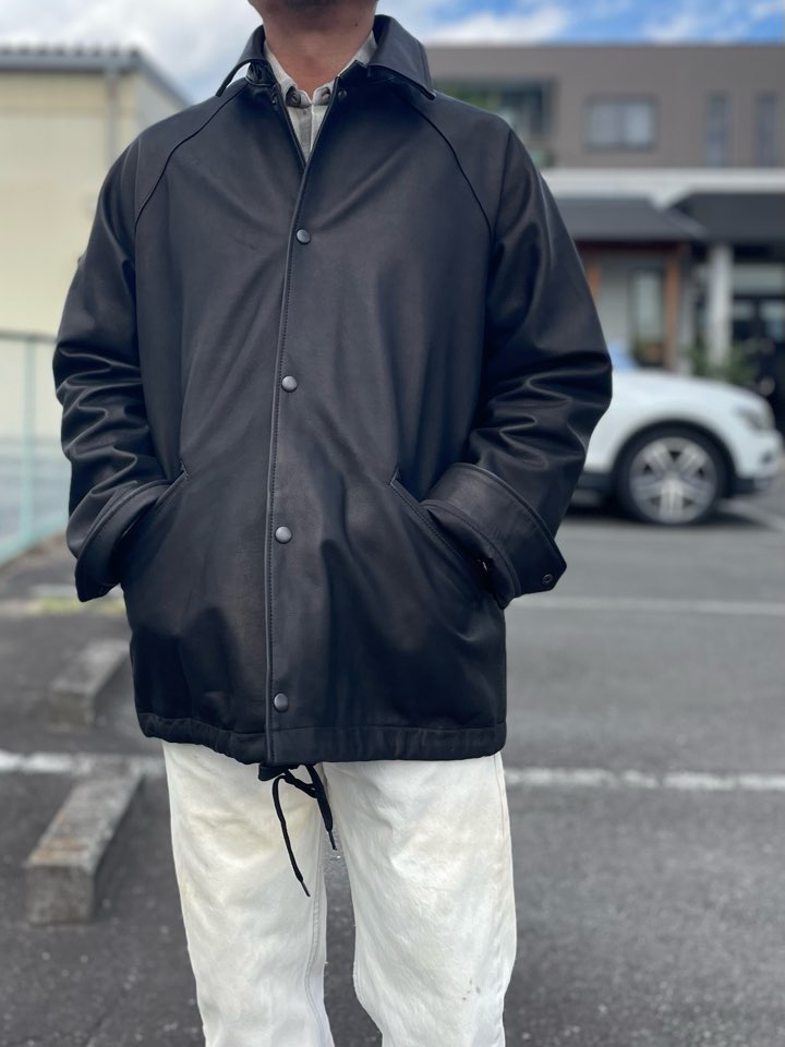 やや硬さのあるレザーですが、極力薄手に仕上げ、袖付けもラグランスリーブにすることでなだらかな肩のライン。