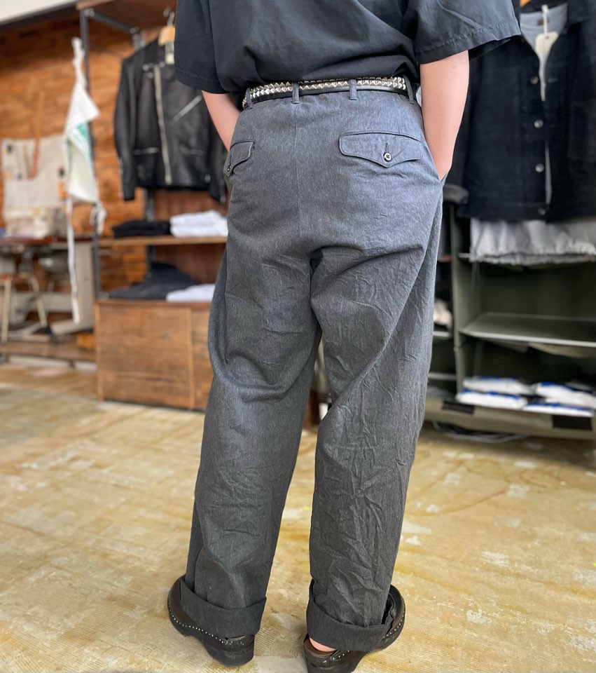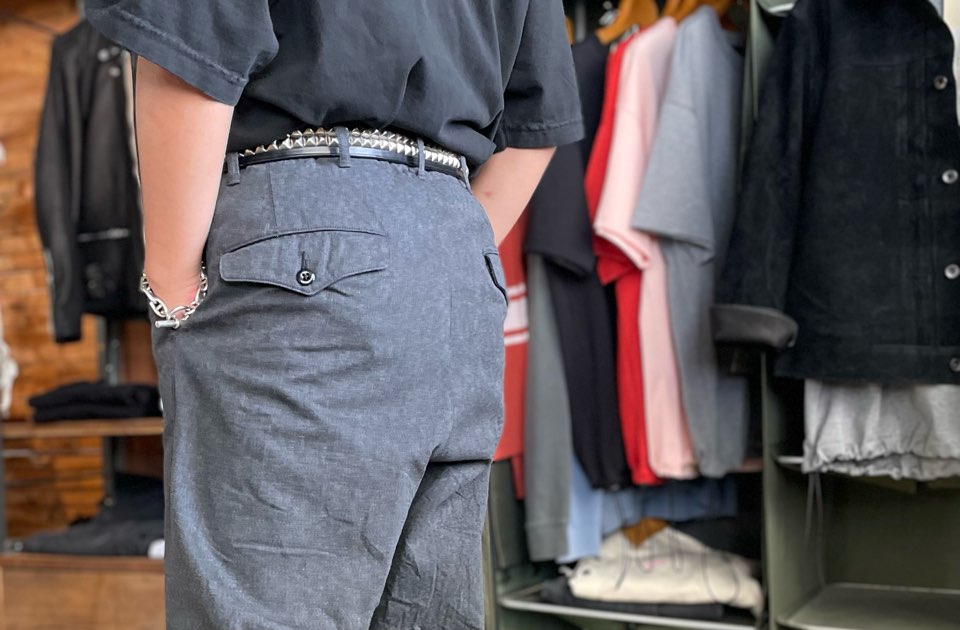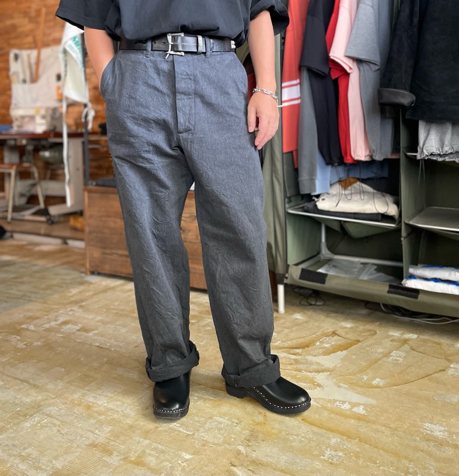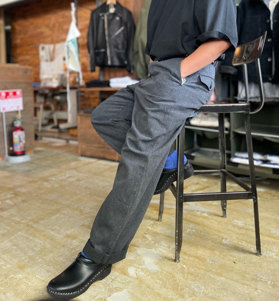 定番のセルビッチチノを使ったワイドシルエットのチノトラウザー。