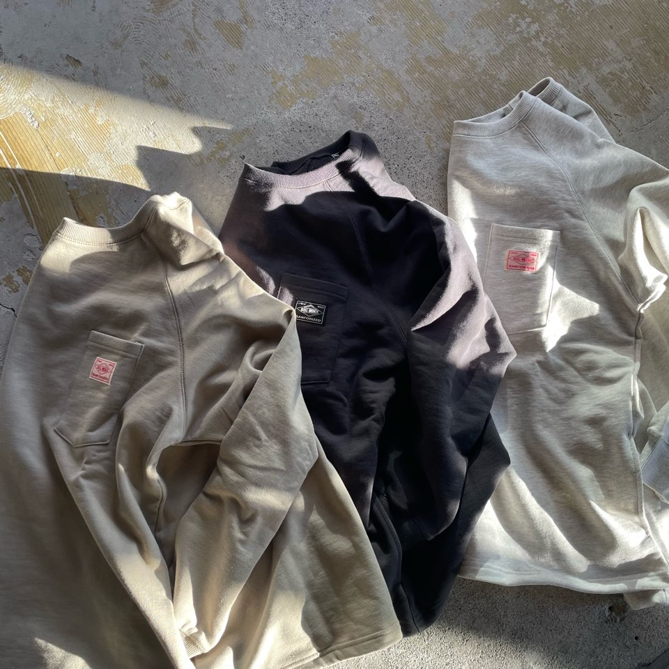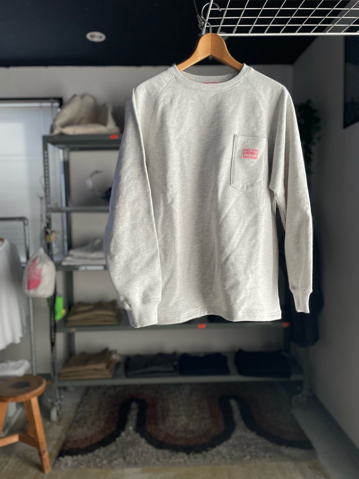 コットン100%の優しい肌触り・胸のサングラスポケット・浅めのクルーネック・ゆったりシルエットのラグランスリーブとベーシックで無駄のない