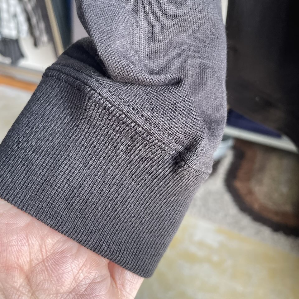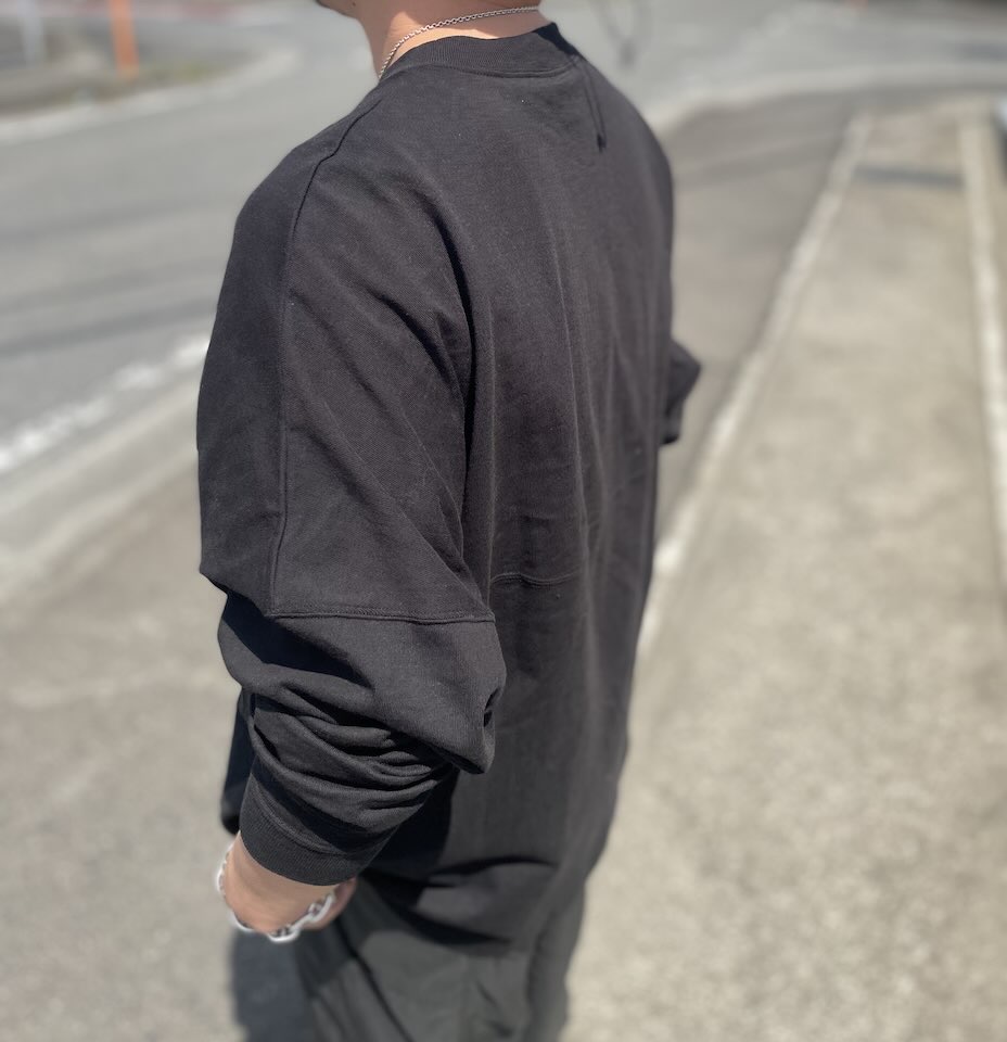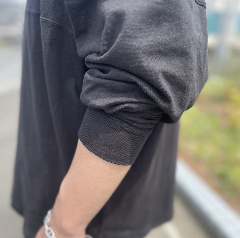 メリハリのある袖のリブ、ルーズなネック。ラインを拾わないシルエット。