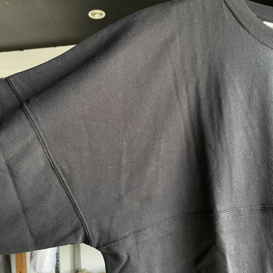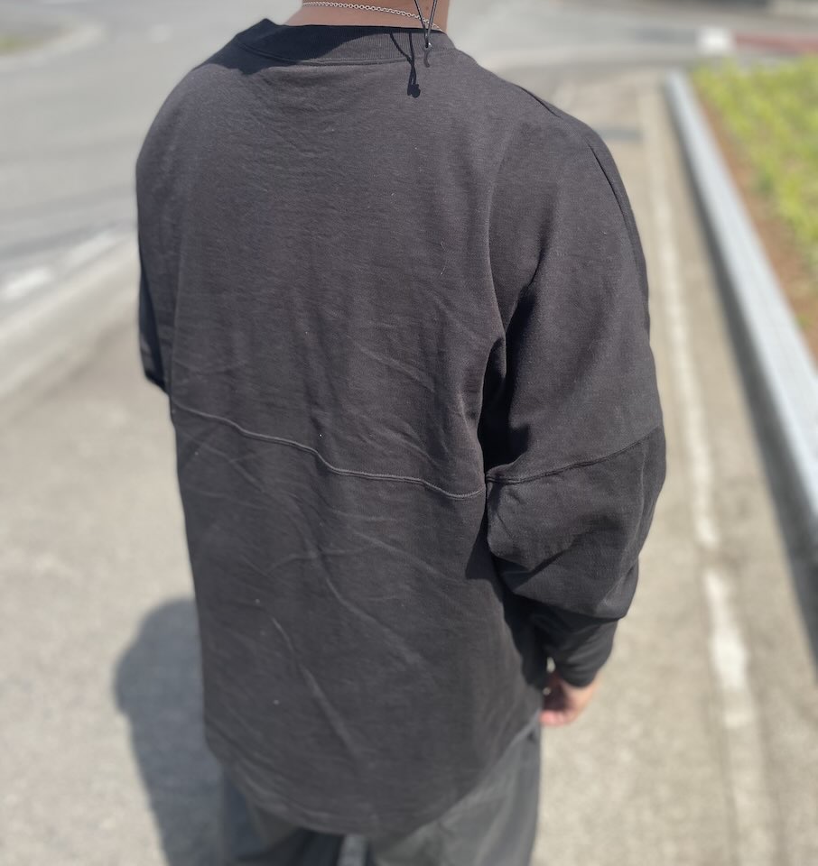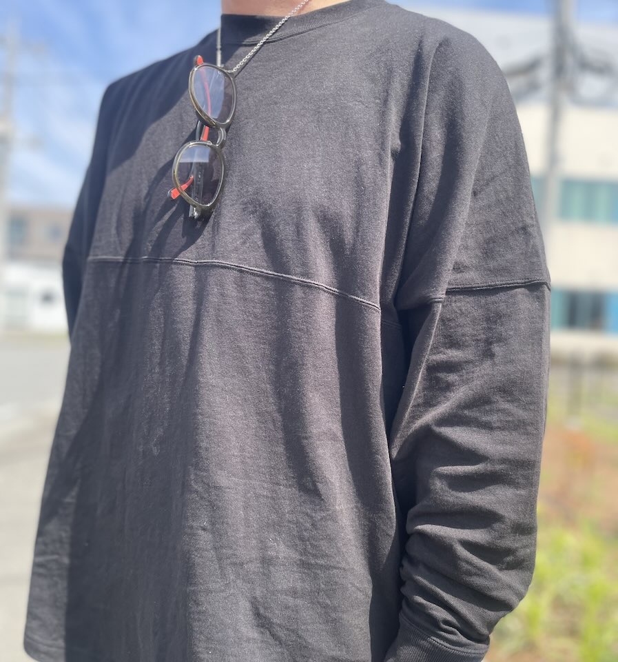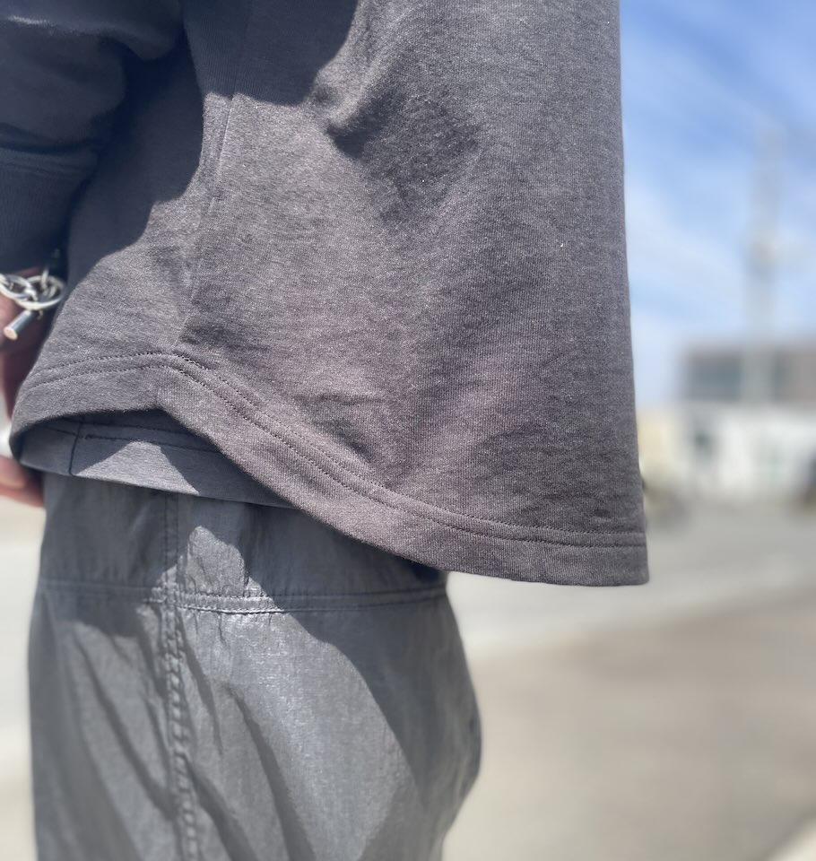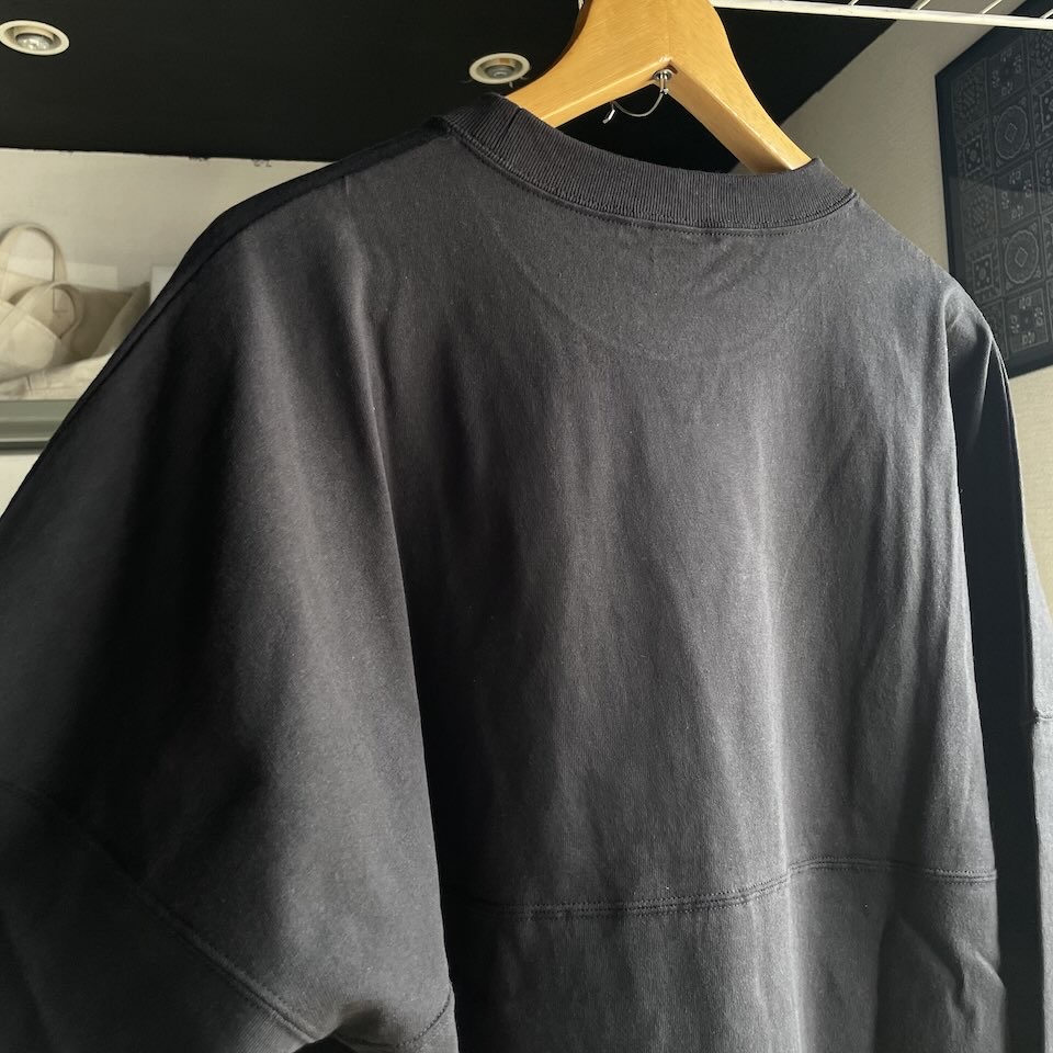 以前にも他のブランドさんに作ってもらいましたが、今回は夏でも着られる生地感と首回りのルーズさを。って言うのがポイントです。