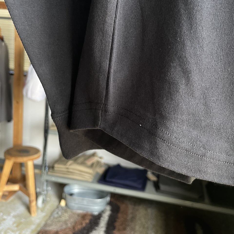 細番手の糸で約6ozと夏のTシャツくらいの生地感で柔らかく編み立てていただきました。