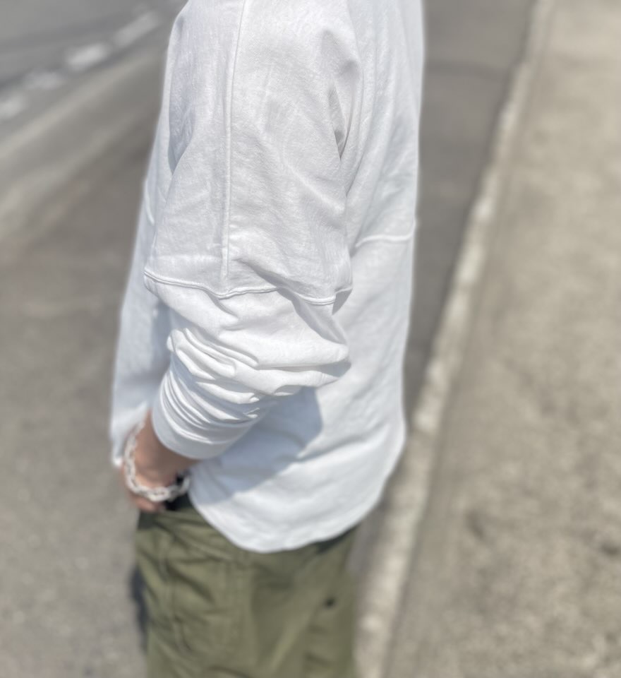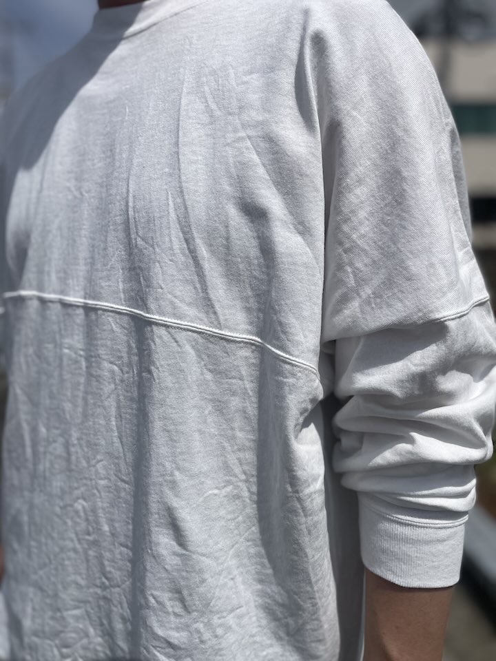 細番手の糸で約6ozと夏のTシャツくらいの生地感で柔らかく編み立てていただきました。