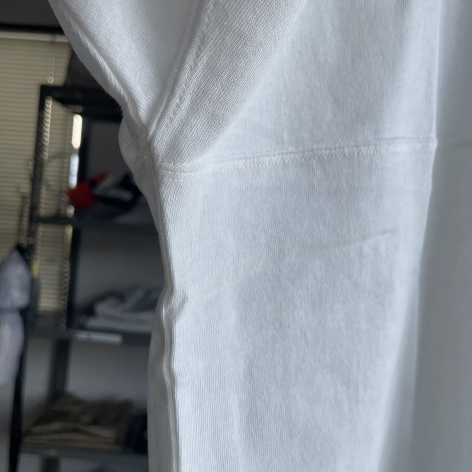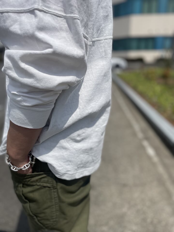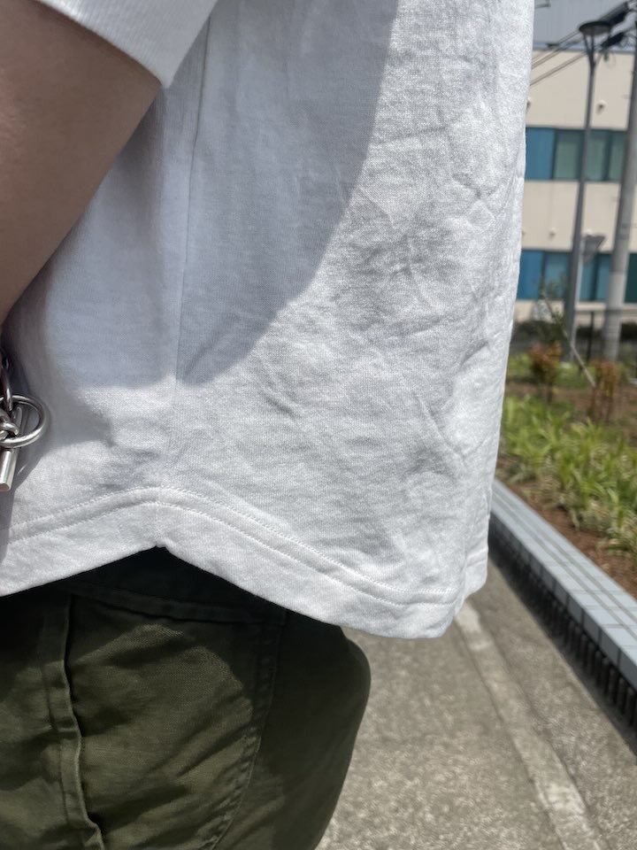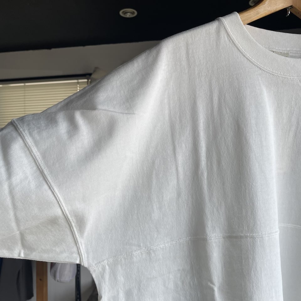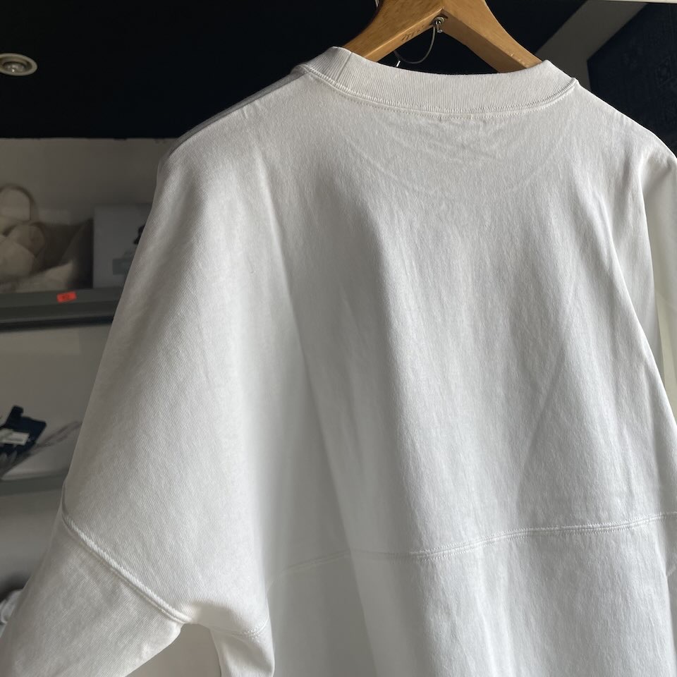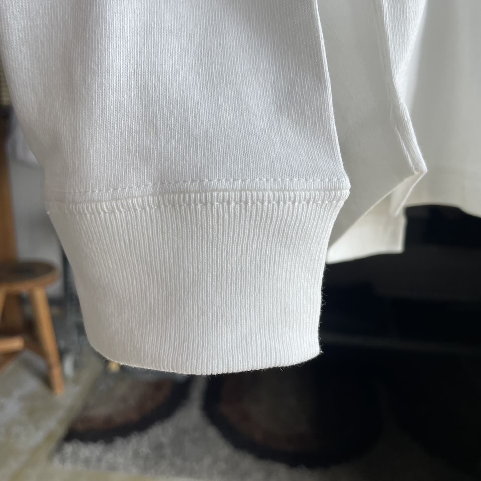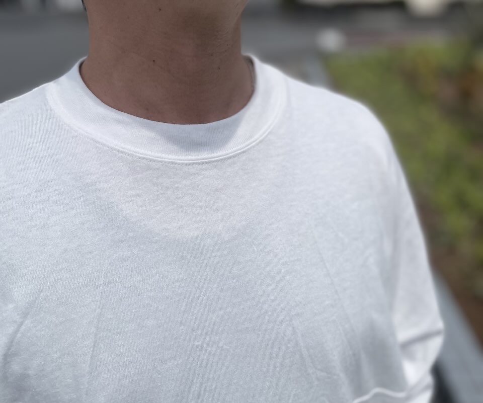 以前にも他のブランドさんに作ってもらいましたが、今回は夏でも着られる生地感と首回りのルーズさを。って言うのがポイントです。
