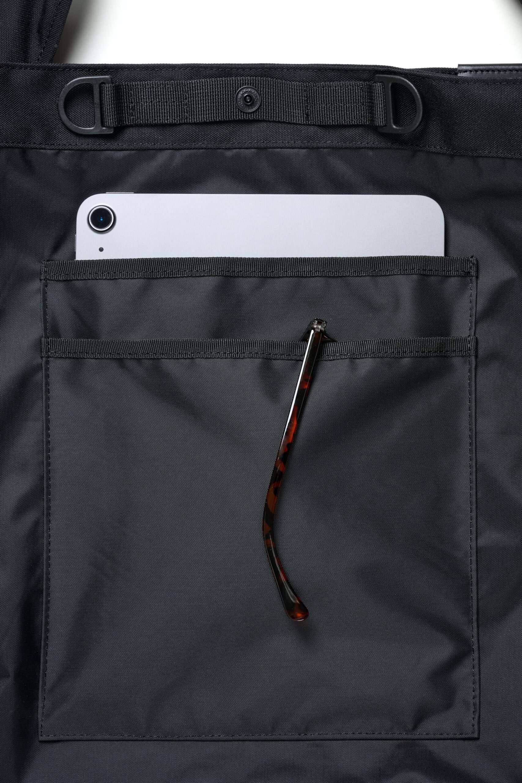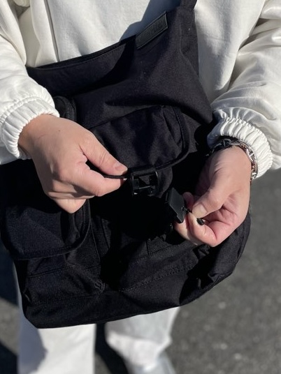フロントに付けられた存在感のある3つのポケットが特徴的なショルダーバッグ。