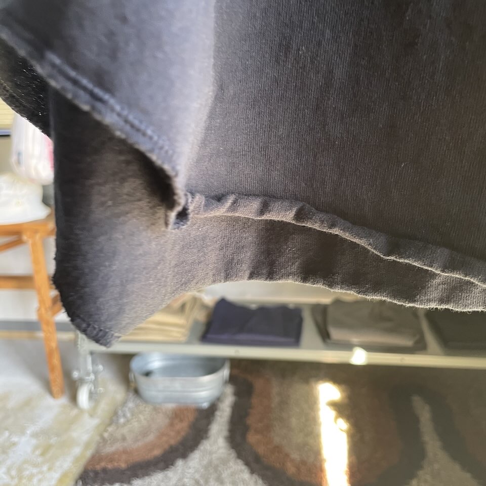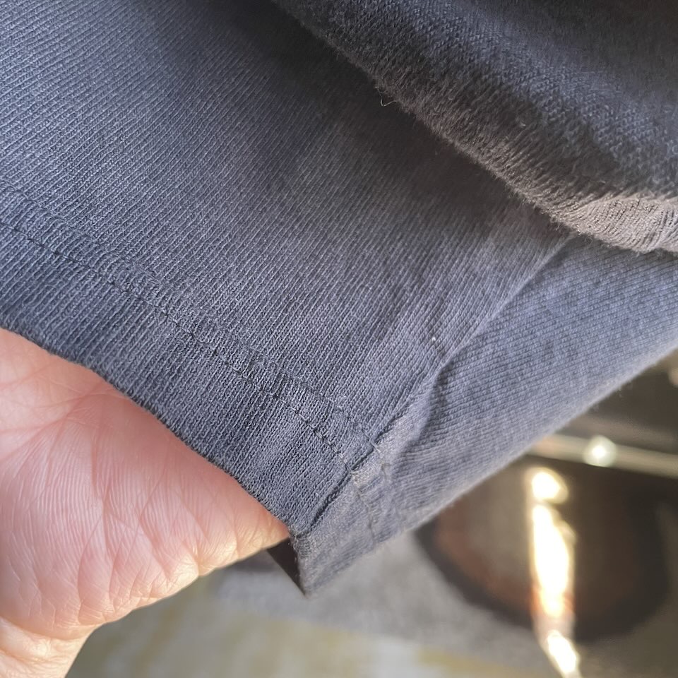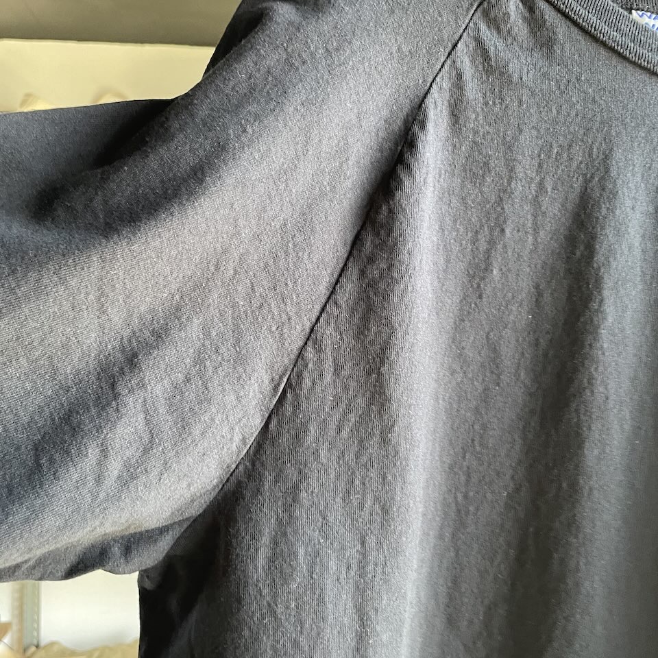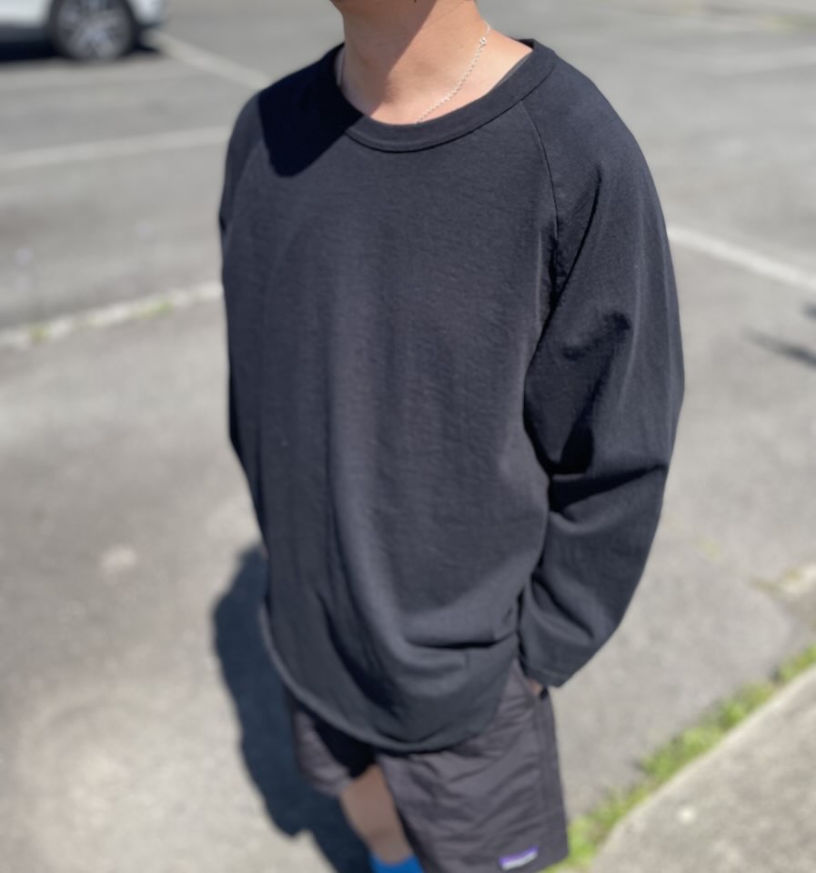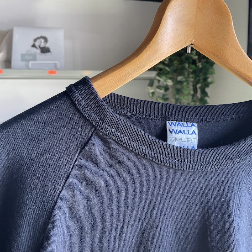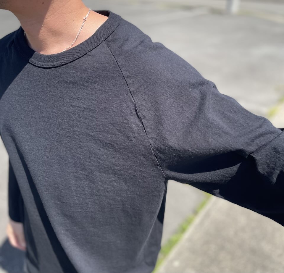 アメリカっ!!!って感じの硬い生地に、脇は縫い目のない丸胴、ラグランスリーブ、詰まったバインダーネック。。