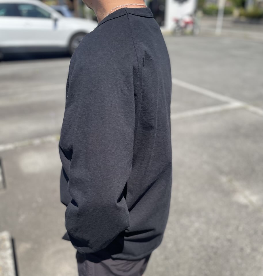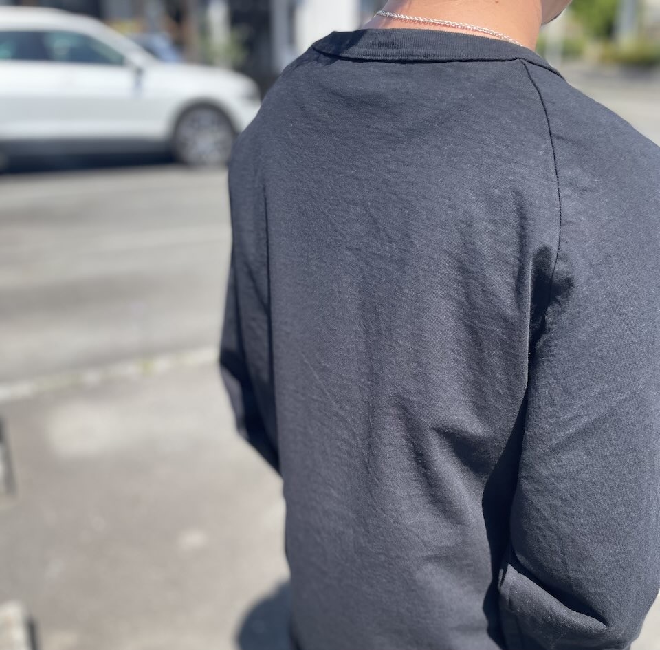 アメリカンアスレチックウェアといえばのディテールである丸胴使いのデザインと裾のラウンドカット、ラグランスリーブ、ネックのバインディングが特徴です。