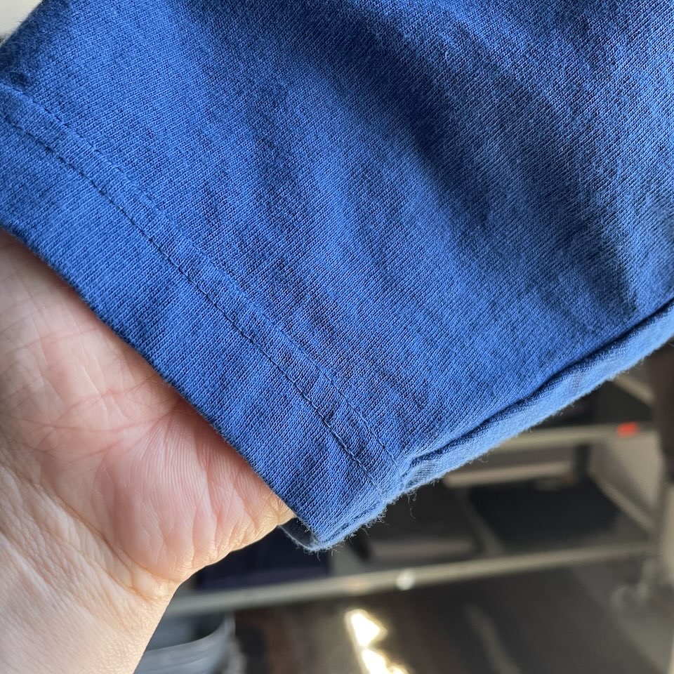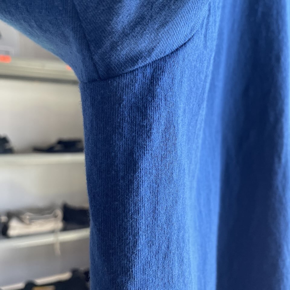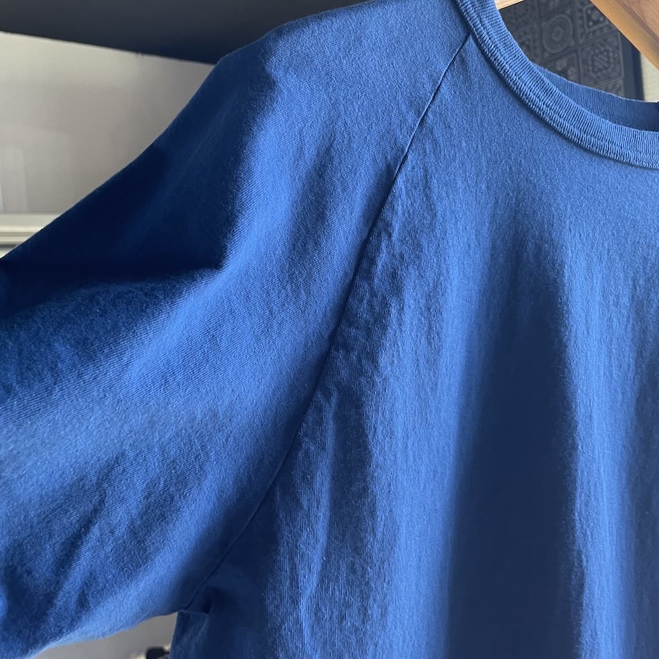 アメリカっ!!!って感じの硬い生地に、脇は縫い目のない丸胴、ラグランスリーブ、詰まったバインダーネック。。