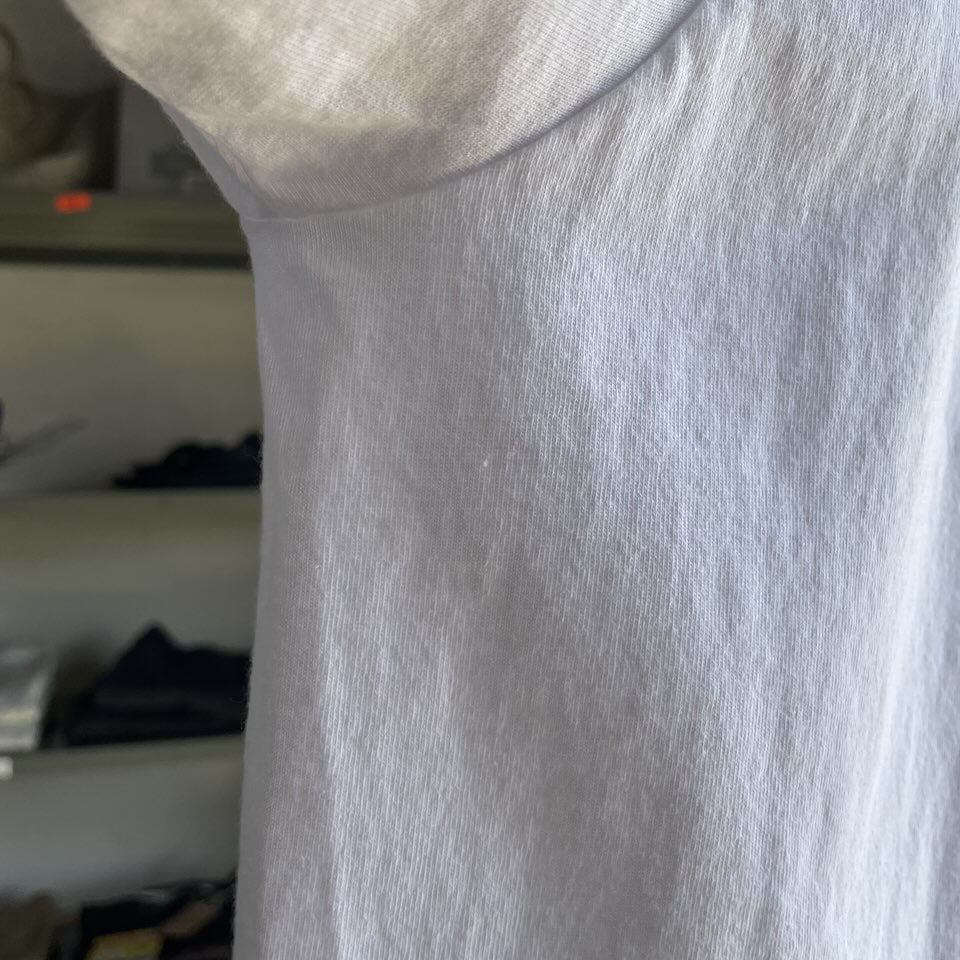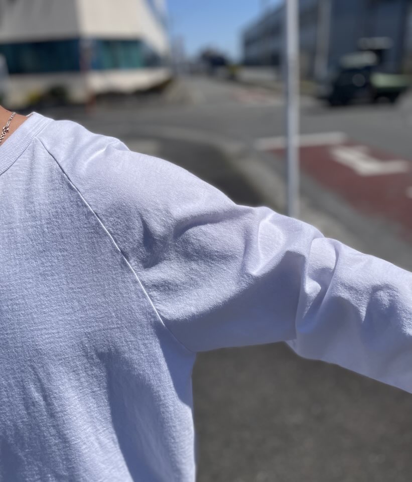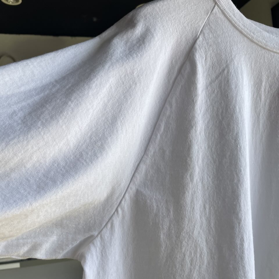 アメリカっ!!!って感じの硬い生地に、脇は縫い目のない丸胴、ラグランスリーブ、詰まったバインダーネック。。