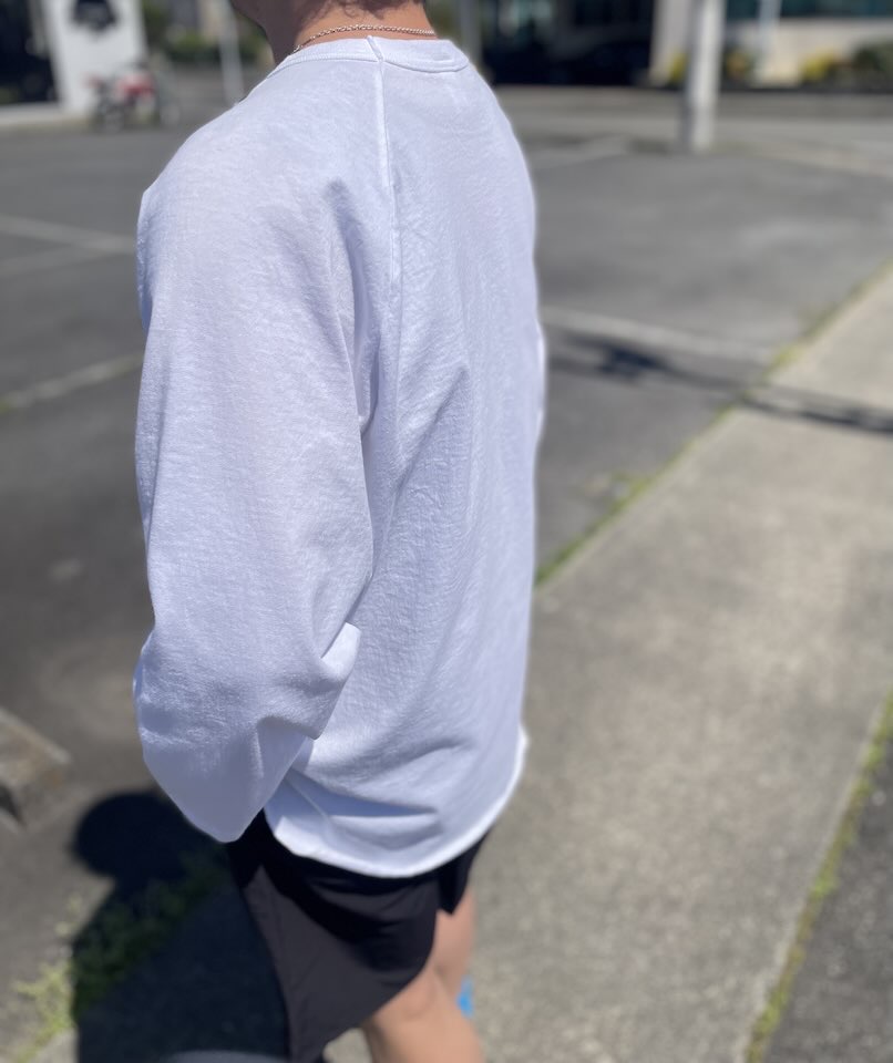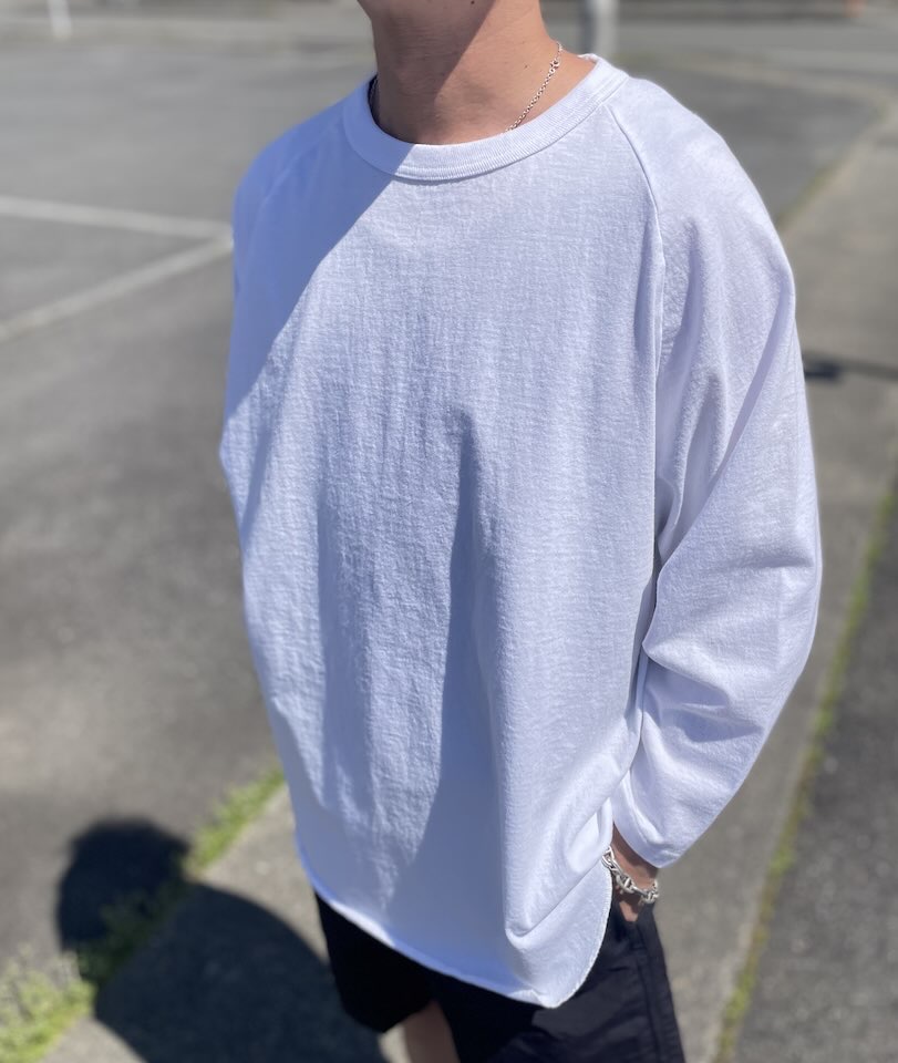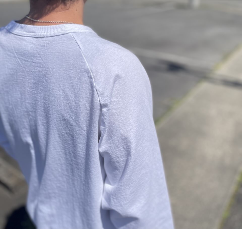 アメリカンアスレチックウェアといえばのディテールである丸胴使いのデザインと裾のラウンドカット、ラグランスリーブ、ネックのバインディングが特徴です。